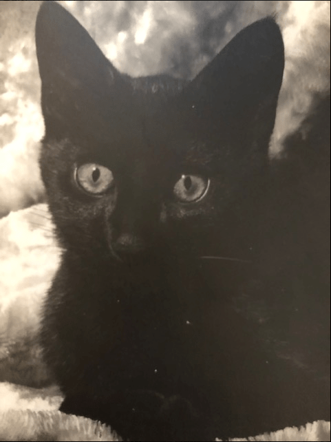 He was a pleasant fellow, and chatted amiably with my mother and me as he told me where to sit or stand or look. In between shots, he confessed that most of his professional work was as an animal photographer—a fact that was instantly exploited by the eight-month-old female kitten my parents had adopted months earlier. Her name was Cleo, and she was all cat—effortlessly sleek, infinitely more poised than I was, and commanding of the room. So, it was inevitable that when he draped a silvery velvet cloth over his camera case, she immediately settled into it.